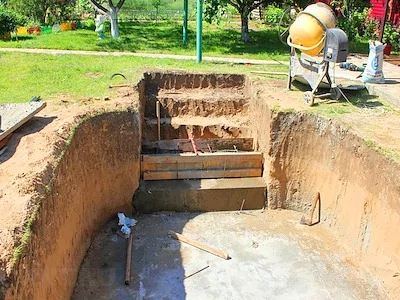 Организация котлована: Начальный этап заключается в выемке земли до достижения водоносного слоя. Глубина и ширина котлована зависят от множества условий, включая тип почвы.
